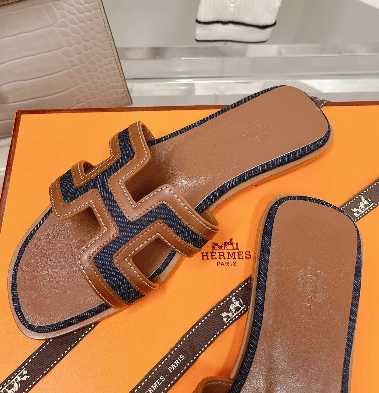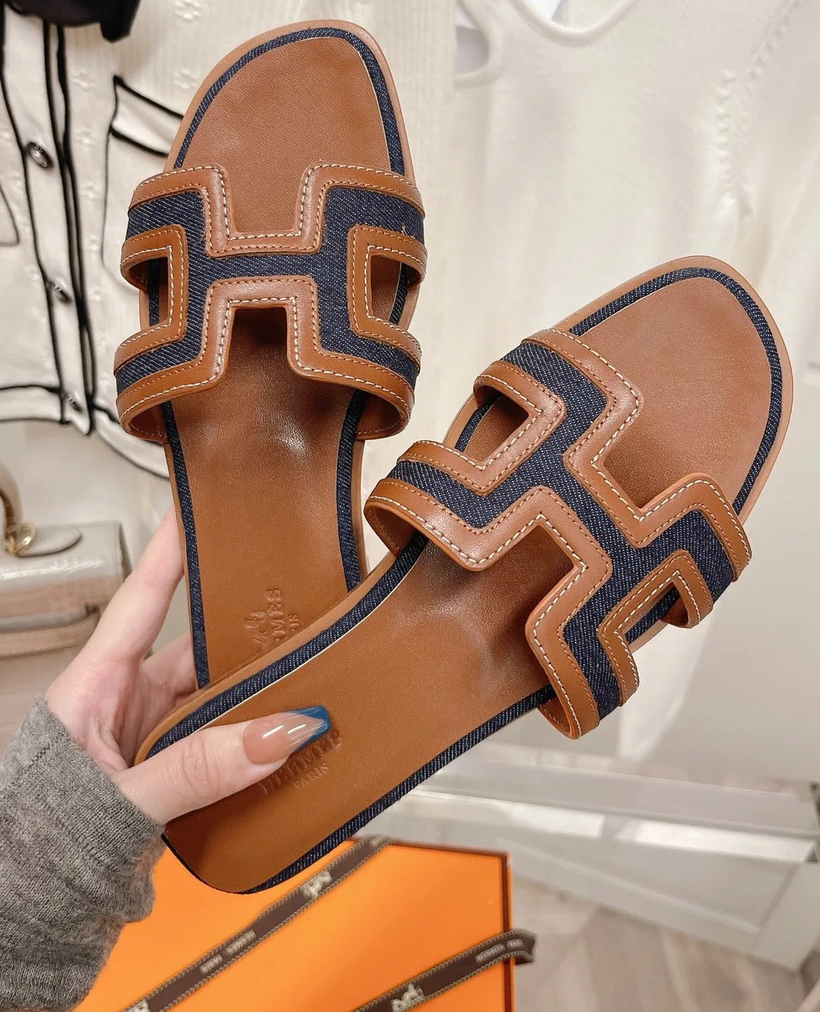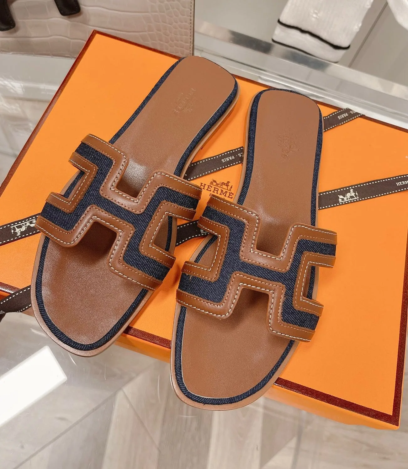 Início New In Rasteira Hermès Oran H denim e caramelo