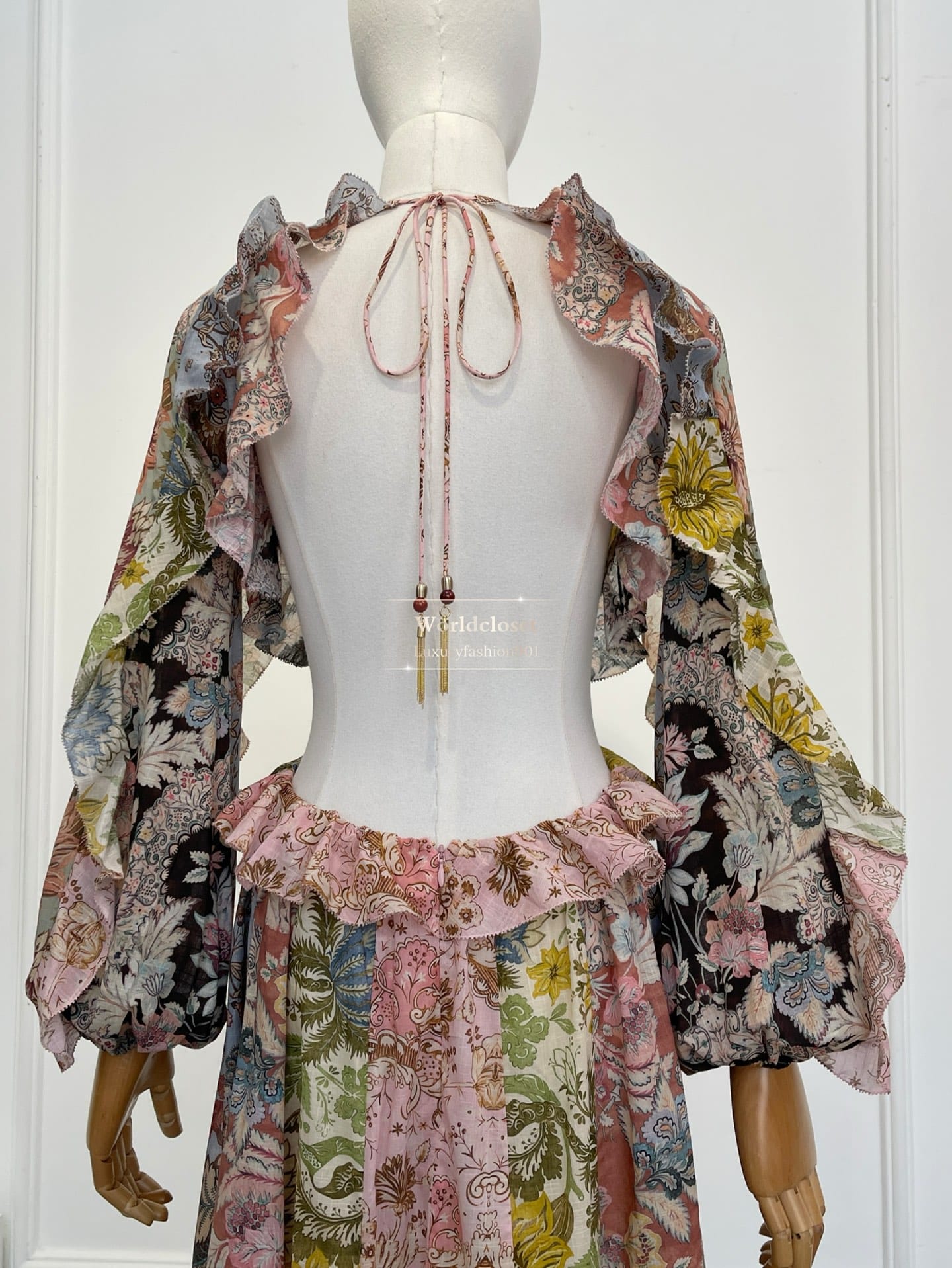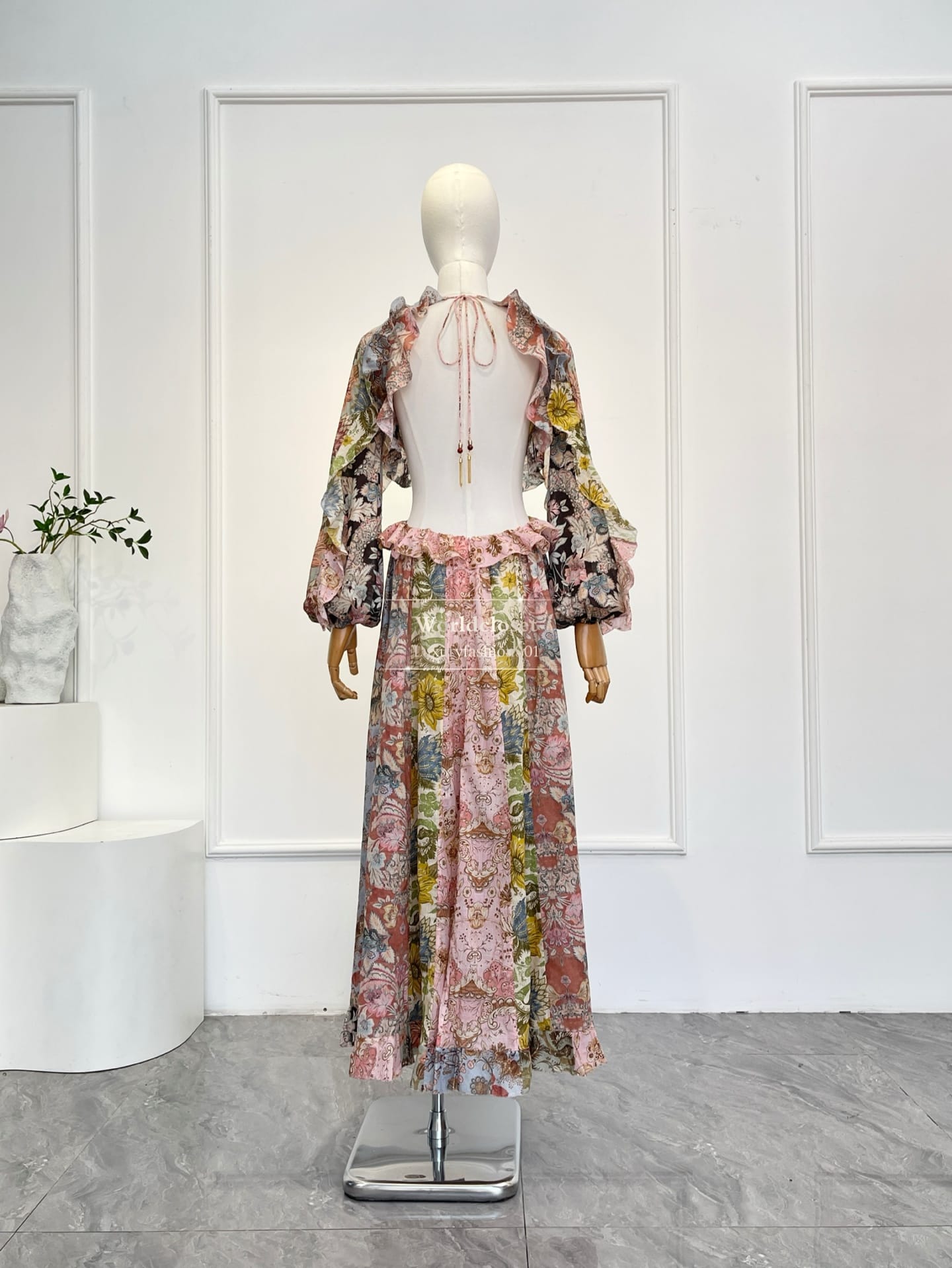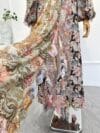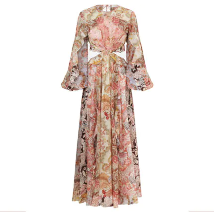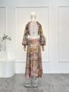 A silhueta fluida ganha destaque com mangas longas amplas estilo billow, cintura com recortes laterais e uma saia maxi com fendas frontais que proporcionam leveza e movimento ao caminhar. O decote arredondado e o decote aberto nas costas com amarração e franjas trazem um toque de sensualidade elegante.